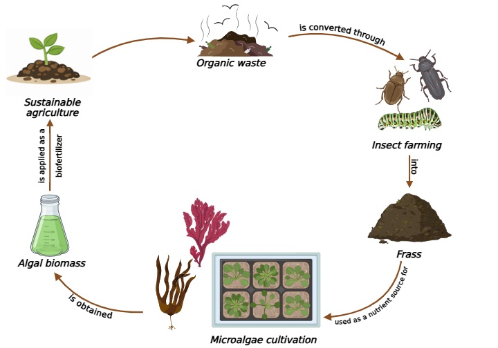 The intensive use of chemical fertilizers has boosted agricultural yields but caused severe environmental concerns, including soil degradation, water pollution, and greenhouse gas emissions. Sustainable alternatives are therefore urgently needed. Insect frass, a nutrient-rich by-product of insect farming, and microalgae, with their ability to produce phytohormones and improve soil quality, have both been proposed as promising biofertilizers. While their individual applications are well documented, little attention has been given to their combined use. This review provides an updated synthesis of current knowledge on insect frass composition, the agronomic value of microalgae, and the first experimental evidence on the use of frass as a nutrient source for microalgal cultivation. Benefits and challenges are discussed, including nutrient variability, microbial safety, heavy metal accumulation, and production costs. The integrated perspective offered here highlights the potential of frass–microalgae systems to support circular bioeconomy models and reduce reliance on chemical fertilizers.