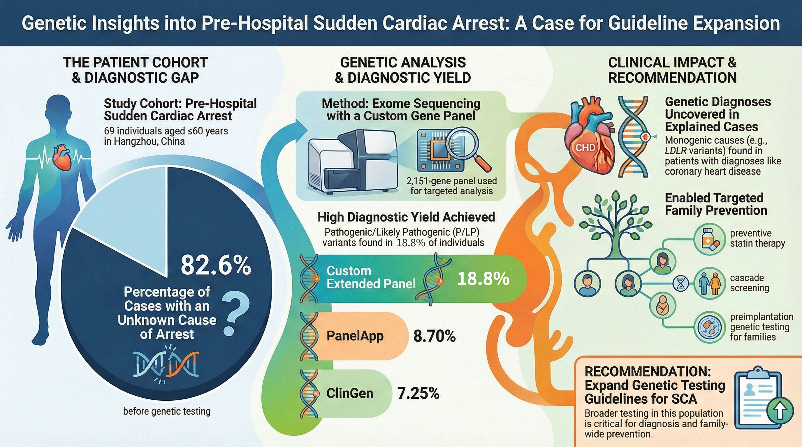 Background: The role of genetic testing in sudden cardiac arrest (SCA) among young and middle-aged adults remains incompletely understood, particularly in pre-hospital settings and in individuals with established clinical diagnoses such as coronary artery disease. Methods: We performed whole-exome sequencing with targeted analysis in a city-wide cohort of individuals who experienced pre-hospital SCA in Hangzhou, China. Variants were evaluated using a virtual panel of 2151 cardiovascular-related genes. Variant classification followed the American College of Medical Genetics and Genomics guidelines. Results: A total of 69 individuals (mean age 38 ± 14.6 years) were included. Pathogenic or likely pathogenic variants were identified in 13 individuals, corresponding to a diagnostic yield of 18.8%. One individual carried two variants. The identified variants involved genes associated with cardiomyopathies, arrhythmia syndromes, metabolic disorders, and lipid metabolism. Genetic findings were observed both in individuals without a clear clinical diagnosis and in those with apparently established causes of cardiac arrest, including coronary artery disease. When rare variants of uncertain significance with supportive evidence were considered, up to 47.8% of individuals carried potentially relevant variants. Broader gene panels identified more variants than narrower panels limited to established sudden cardiac death genes. Conclusions: Systematic exome sequencing in young and middle-aged individuals with pre-hospital SCA identifies clinically relevant genetic variants in a substantial proportion of cases. Genetic testing may complement conventional clinical investigation and may contribute to molecular autopsy and family-based risk assessment in selected patients.