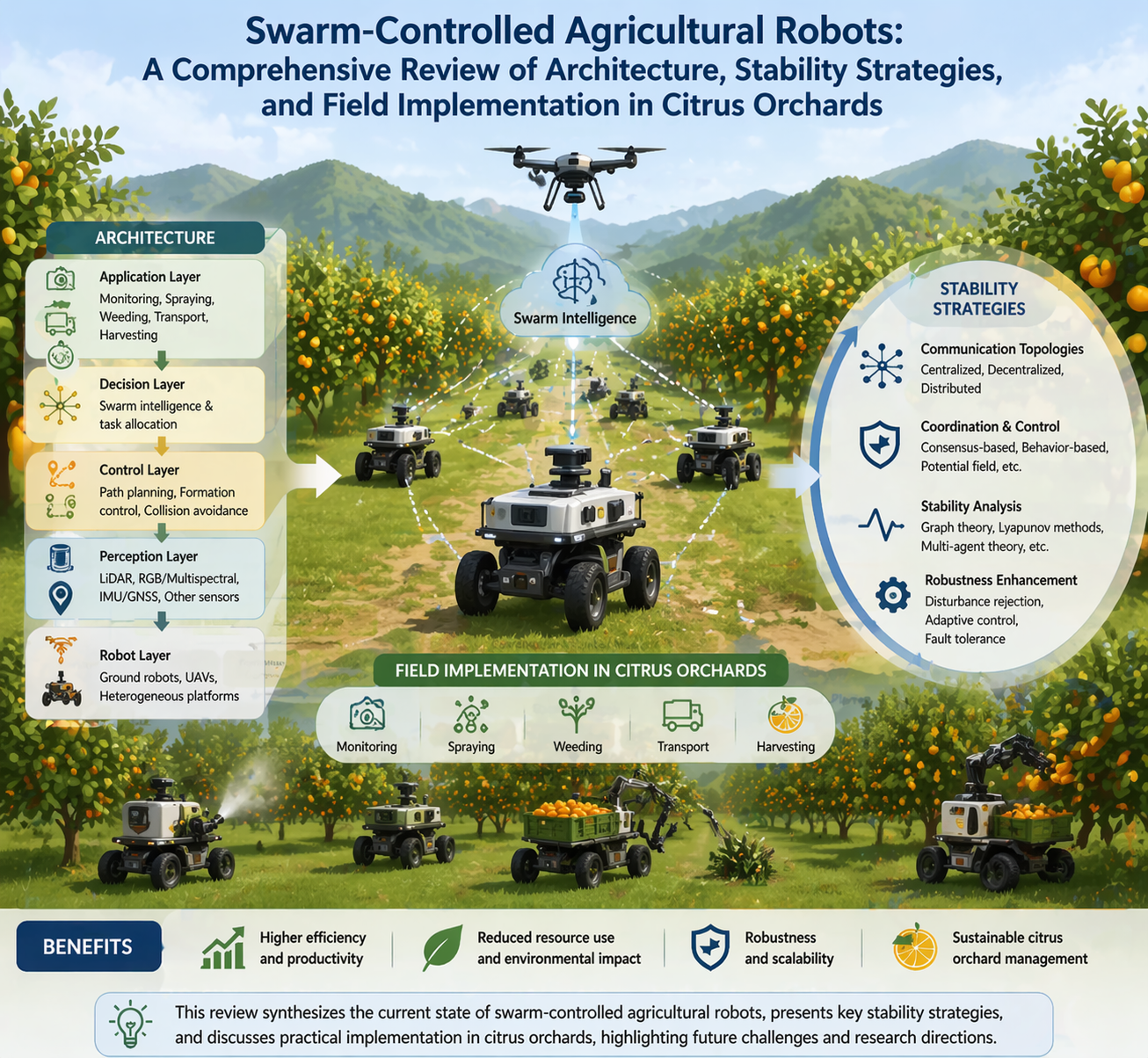 The rapid expansion of agricultural robotics is increasingly constrained by complex field environments, operational variability, and the growing demand for coordinated multi-robot tasks, rendering traditional single-robot systems insufficient for modern agricultural production. Although swarm control has emerged as a promising solution, existing studies lack a systematic framework that integrates coordination architecture, agricultural scenario adaptation, and field-level validation. This paper analyzes and highlights the importance of Swarm-Controlled Agricultural Robots (SCAR), and summarizes current research hotspots regarding the integration of SCAR with agriculture. Secondly, we present a structured framework for Swarm-Controlled Agricultural Robots based on three core dimensions: swarm coordination architecture, crop-oriented task adaptation, and environmental robustness design. The proposed model integrates centralized–distributed hybrid control, task-specific parameter optimization, and anti-interference mechanisms tailored to complex orchard environments. Based on this framework, representative application paradigms in precision planting, collaborative harvesting, and intelligent management are analyzed, and stability enhancement strategies are proposed from hardware, algorithmic, and communication perspectives. Long-term field validation conducted in citrus orchards from 2021 to 2025 demonstrates that the proposed framework improves operational efficiency by 45%, achieves positioning accuracy within one centimeter, and significantly enhances environmental adaptability compared with conventional single-robot systems. This research provides a practical foundation for large-scale deployment of agricultural multi-agent systems.