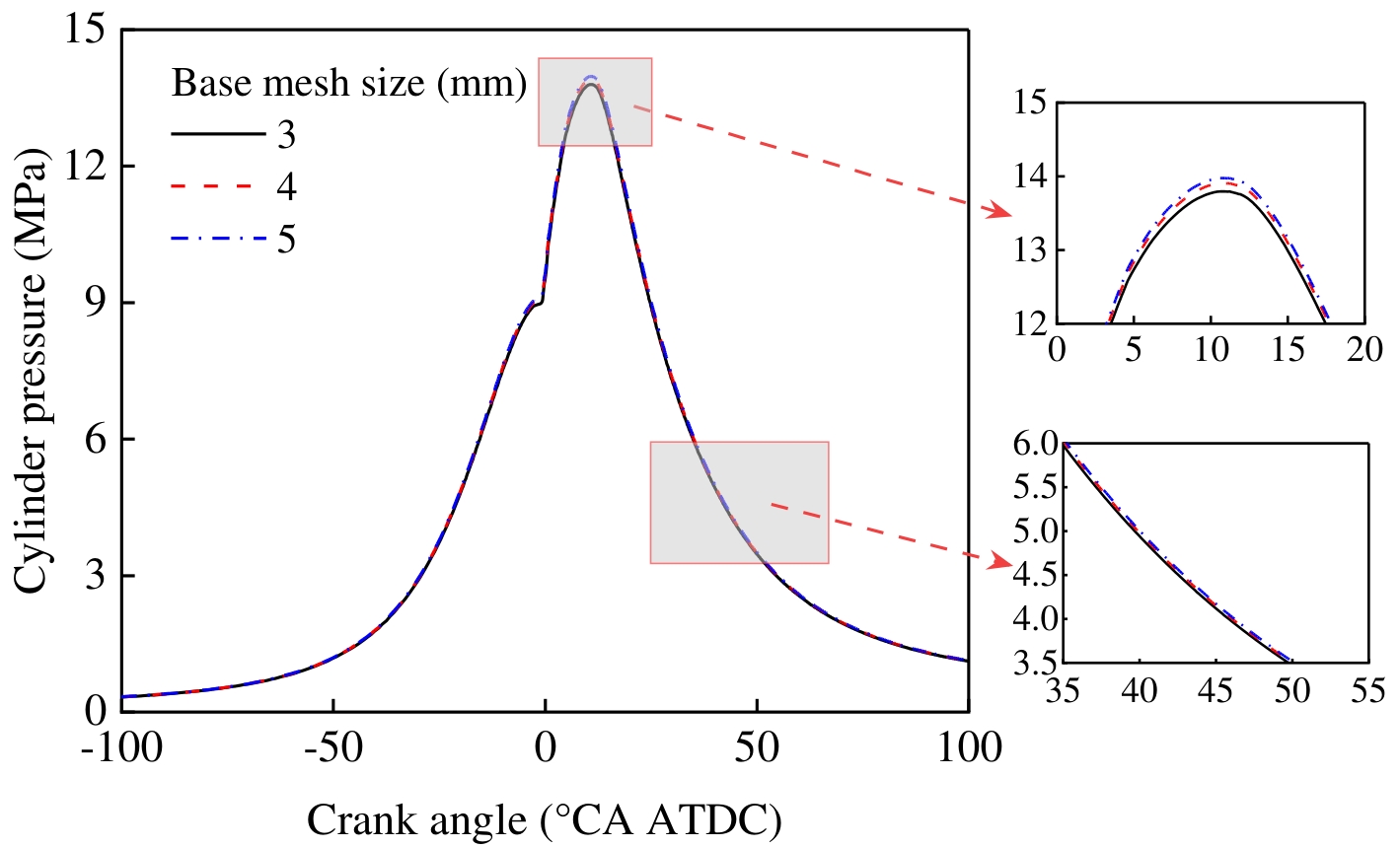 The mesh size has a significant impact on the computational efficiency and prediction accuracy of CFD simulations. Larger meshes can increase the computational speed, but it is often difficult to accurately capture key flow characteristics and combustion details. Although too fine a mesh is conducive to improving accuracy, it will significantly increase the computational cost. Therefore, under the premise of ensuring the accuracy of the simulation results, it is particularly important to reasonably select the basic mesh size to balance accuracy and computational efficiency. In order to verify the sensitivity of the simulation results to the mesh size, this paper uses three basic mesh scales, namely coarse mesh (5 mm), medium mesh (4 mm), and fine mesh (3 mm), to carry out mesh independence analysis. Figure 3 shows a comparison of in-cylinder pressure under three different grid conditions. As shown in Figure 3, when the base grid size is 4 mm, further mesh refinement has a negligible impact on in-cylinder combustion. Considering both accuracy and computational efficiency, a 4 mm base grid size is selected for subsequent simulations. Structured hexahedral meshes are automatically generated using CONVERGE software (Version 3.1, Convergent Science, Inc., Madison, WI, USA), incorporating adaptive refinement based on the base grid size and a fixed-area refinement strategy. During the injection duration, mesh refinement is applied to the fuel spray region using a three-level refinement strategy, with the minimum grid size set to 0.5 mm.