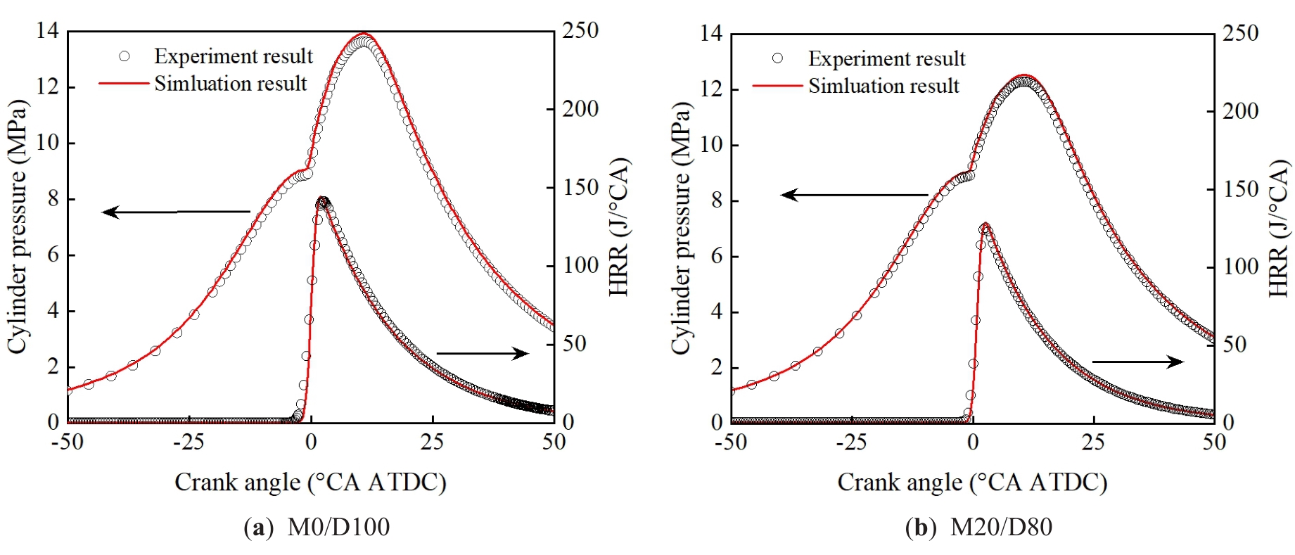 Selecting appropriate physical and chemical models is crucial for ensuring the accuracy of combustion process simulations. In terms of turbulence modeling, the Renormalization Group (RNG) k-ε turbulence model [25] was adopted in this study. This model effectively captures the flow characteristics in low Reynolds number regions and demonstrates high accuracy and stability in complex shear flows and vortex scales. In terms of droplet dynamics modeling, in order to accurately describe the collision behavior between droplets and their interaction with the wall during the spray process, the NTC collision model [26] and the O’Rourke model [27] were used for joint modeling. The droplet evaporation process was modeled using the Frossling model [28], which is based on heat and mass transfer theory and can effectively predict the evaporation rate of droplets in different temperature fields. The Kelvin-Helmholtz/Rayleigh-Taylor (KH-RT) model [29] is used to simulate the spray breakup process. This model effectively captures both primary and secondary breakup mechanisms, making it one of the most mature spray modeling methods in current CFD applications. In terms of chemical reactions, the SAGE combustion model [30] is employed, coupling detailed chemical reaction mechanisms to simulate the in-cylinder combustion process of a methanol/n-heptane blended fuel. The adopted kinetic mechanism includes 52 species and 182 reaction steps [31]. Additionally, for pollutant formation, the Extended Zeldovich mechanism is used to predict the generation of NOx, while the Hiroyasu-NSC soot model is applied to describe the formation and oxidation behavior of soot particles.