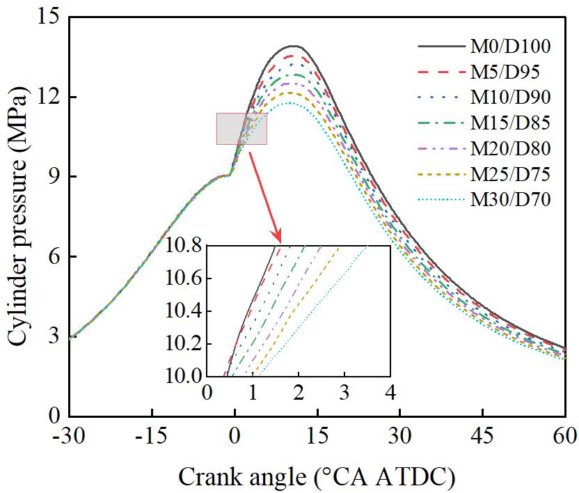 Figure 5.Effect of methanol blending ratio on cylinder pressure.