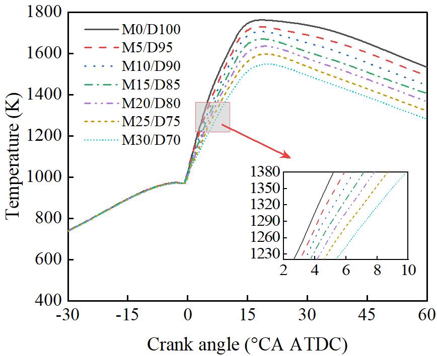 3.2.Effect of Methanol/Diesel Ratio on Engine Cylinder Temperature