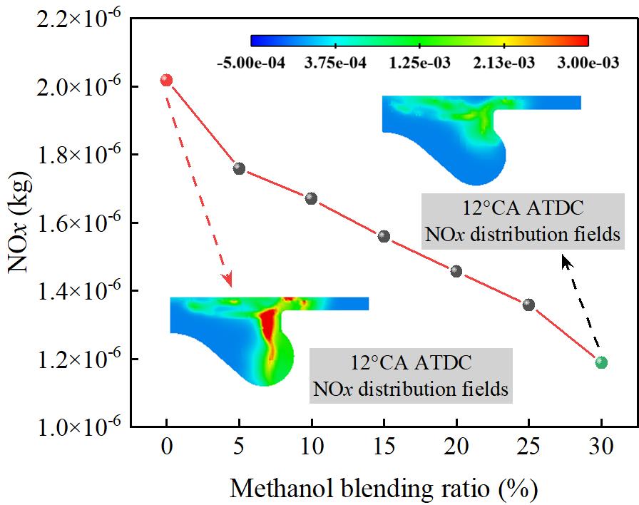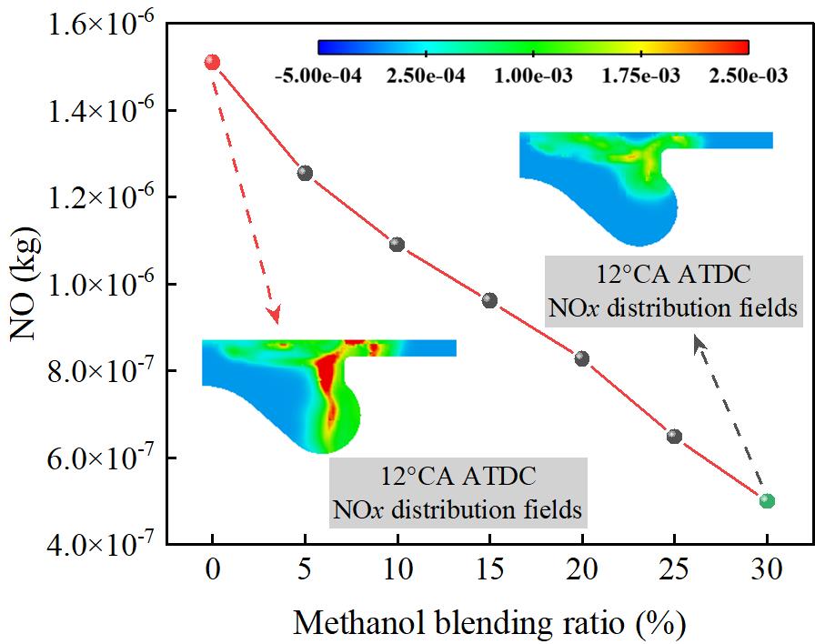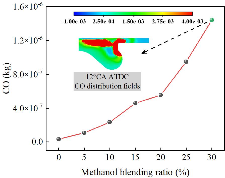 (3) With the increase of the methanol blending ratio, CO emissions increased significantly, and the increase was the largest when the methanol blending ratio was 30%. Compared with the original engine, CO emissions increased by 44.23 times.