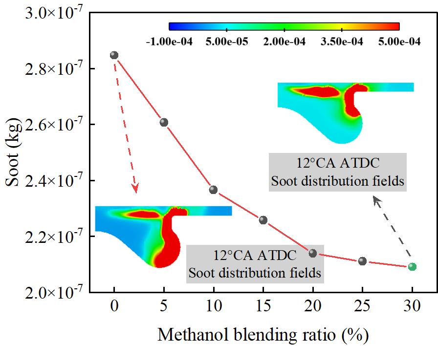 Figure 9 shows the effect of different methanol/diesel blend ratios on soot emissions. As shown in Figure 9, Soot emissions significantly decrease with an increase in the methanol blend ratio. At M30/D70, soot emissions reach their lowest level, with a 26.54% reduction compared to the M0/D100. This is due to methanol’s high latent heat of vaporization, which absorbs a significant amount of heat during the spray evaporation process, thereby lowering the local in-cylinder temperature. This reduction suppresses the formation of localized rich fuel zones, weakens the pyrolysis reactions under high-temperature, oxygen-deficient conditions, and consequently reduces soot formation. Additionally, since methanol molecules lack C–C bonds, the formation of polycyclic aromatic hydrocarbons and other soot precursors is limited during combustion, effectively inhibiting the soot formation pathway. Therefore, with an increase in the methanol blend ratio, the combustion process becomes cleaner, leading to a significant reduction in soot emissions.