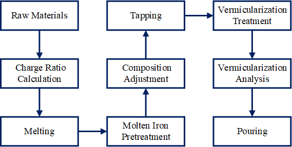 The author’s company specializes in the production of cylinder blocks and cylinder heads. For products requiring superior material properties, compacted graphite iron (CGI) is exclusively used. The core-making process employs a combination of cold-box and hot-box techniques, utilizing the HSW static pressure molding process. For melting operations, a 10-ton Inductotherm medium-frequency induction furnace is utilized, and production incorporates the Online Controlled Carburization vermicularization process (hereinafter referred to as OCC wire-feeding vermicularization) [14]. Since the cylinder head product requires a body tensile strength on the combustion face of ≥500 MPa (achieving internationally advanced levels), the key challenge for enabling stable production of high-quality, high-strength cylinder heads lies in the precise matching and control of critical parameters within both the casting and melting processes.