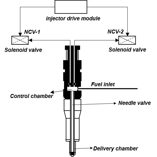 The opening and closing of the needles are controlled by the coupling force of the electromagnetic force, hydraulic pressure in the control and pressure chambers. It should be clarified that the two electromagnetic valves are named as NCV-1 and NCV-2 in this study. The dual-valve and dual-return oil channel design forms the core mechanism for shaping flexible injection patterns. NCV-1 and NCV-2 can operate independently to control the injection rate, or work in coordination to generate more complex injection profiles. The configuration of the two return oil channels enables regulation of the pressure drop rate within the control chamber, allowing precise control of the movement characteristics of the needle valves. By adjusting the drive sequences for NCV-1 and NCV-2, it is possible to generate various fuel injection rate profiles, thereby facilitating fine-tuned control over the injection process.