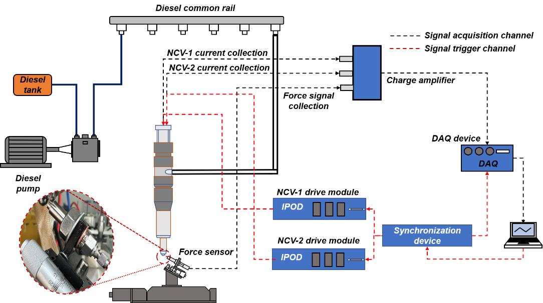 Figure 2 illustrates the injection rate platform based on the spray momentum. This system consists of a fuel supply system, injector, signal trigger module, and data acquisition module. The timing-synchronized microprocessor and data acquisition card are applied for injection triggering and data acquisition. All measurement signals, including injector drive current and force, are captured by the NI-6361 board at a sampling rate of 250 kHz, operating in trigger acquisition mode. The injector drive module employs a parallel dual-channel design, generating drive current for the injector upon receipt of the trigger signal. The device parameters selected by the system are shown in Table 1.