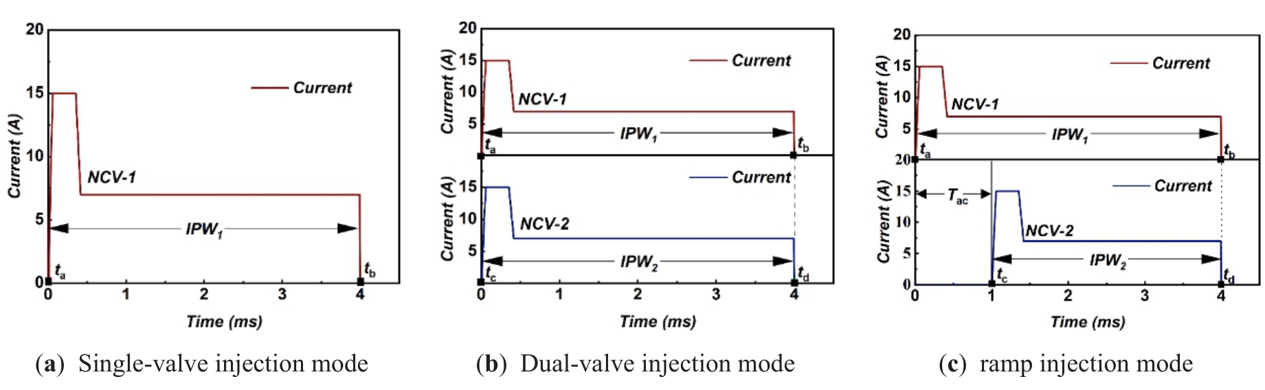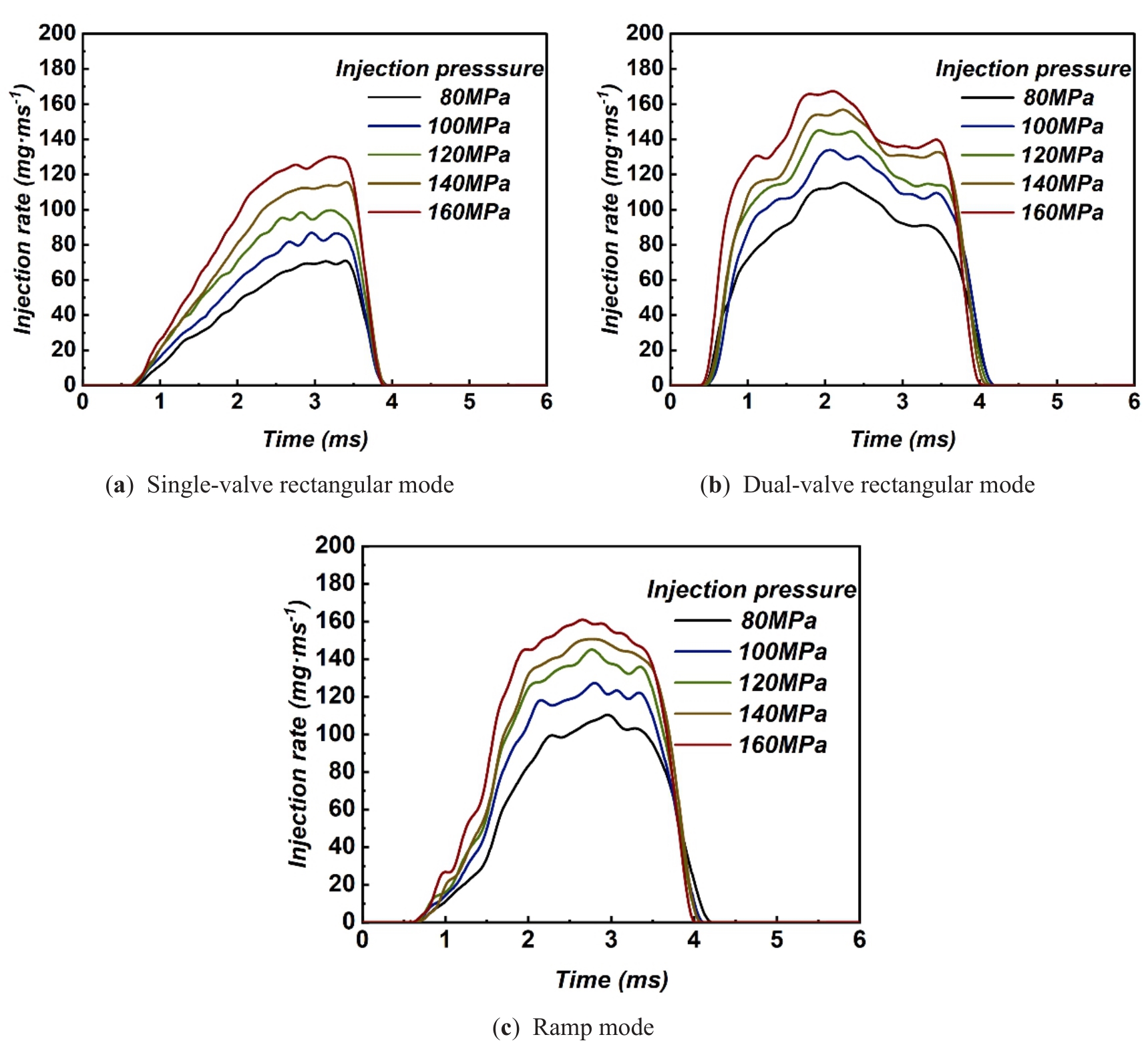 (1) The ramp injection mode initially mirrors the single-valve rectangular mode with a gradual rise in injection rate. Once NCV-2 is activated, the rate rapidly increases, forming a distinctive ramp profile. This staged behavior offers enhanced flexibility in shaping the injection process.