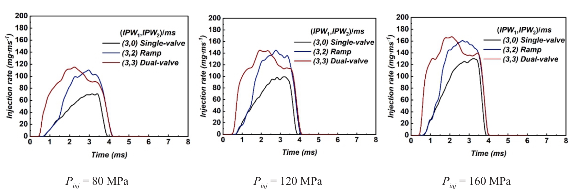 (2) The ramp mode’s injector opening delay is comparable to that of the single-valve rectangular mode but occurs later than in the dual-valve mode. The closing delay, on the other hand, resembles that of the dual-valve configuration and is significantly longer than in the single-valve case.