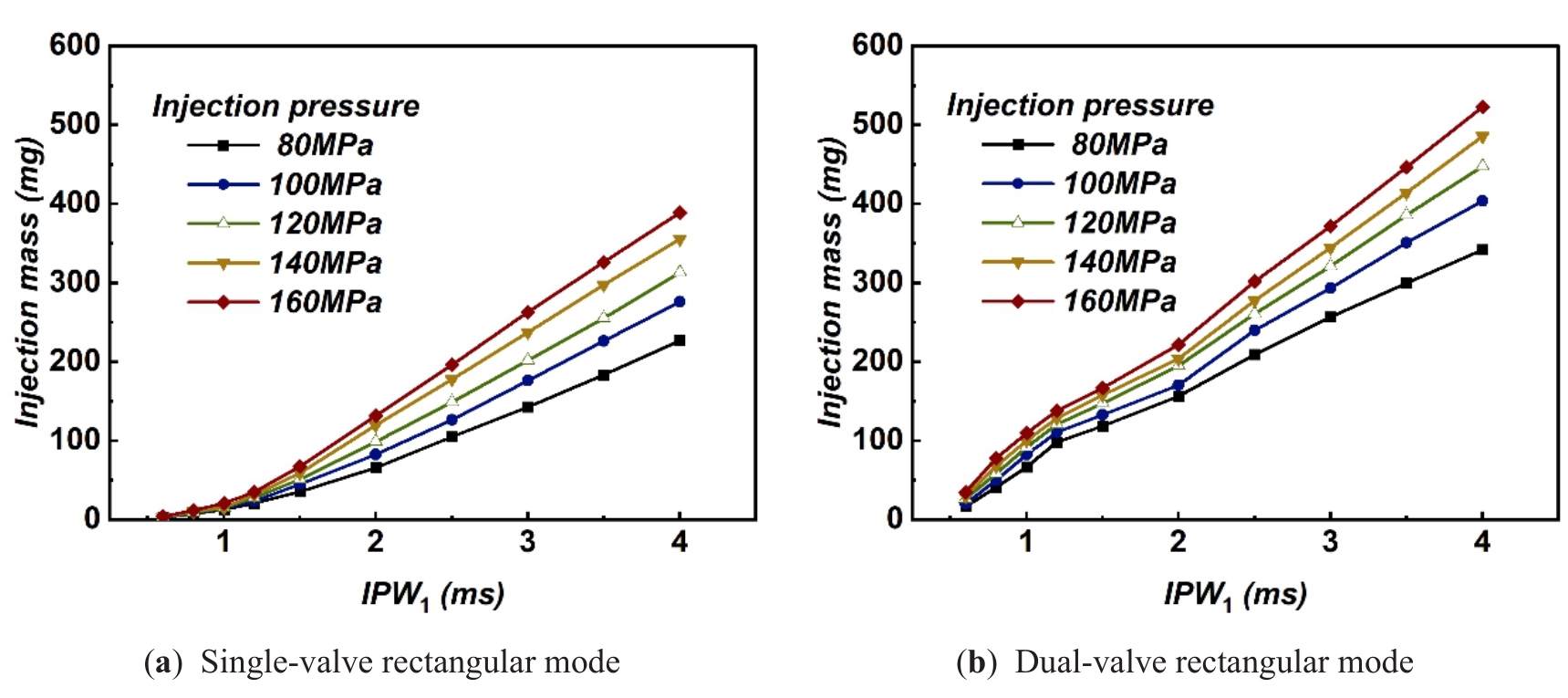 As depicted in Figure 10b, in the dual-valve rectangular mode under short pulse widths, the needle valve does not reach its maximum lift. Here, the injection volume exhibits high sensitivity to pulse width, with a steeper growth rate and relatively limited dependence on injection pressure, resulting in a nonlinear trend. Once the needle valve attains its full lift position, the injector transitions into the stable injection phase, at which point the injection volume increases approximately linearly with pulse width.