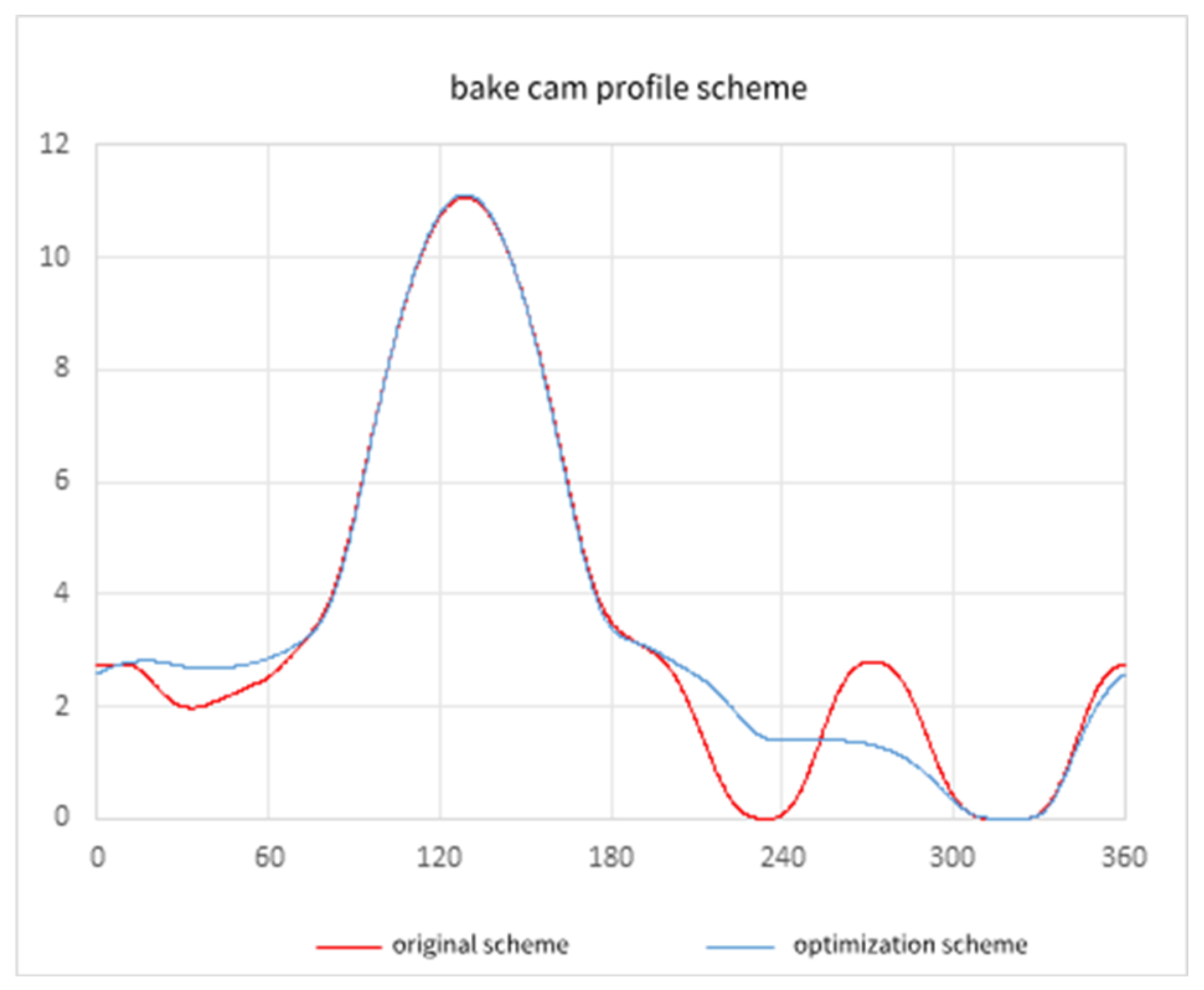 The optimization design proceeded primarily in two directions: first, by refining the existing cam profile to minimize or eliminate the impact force; second, by reducing the brake cam lift, as a lower-lift design more readily achieves a non-impact operational state, as shown in Figure 6.