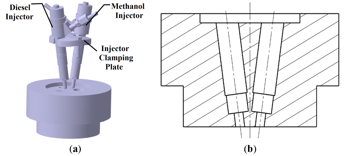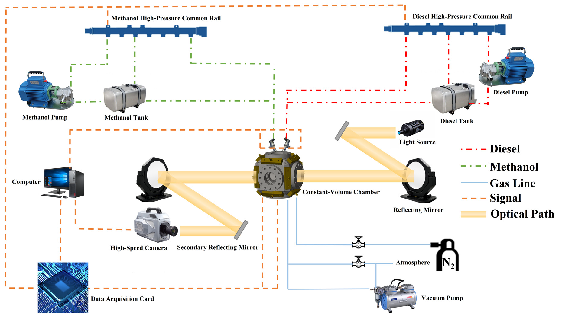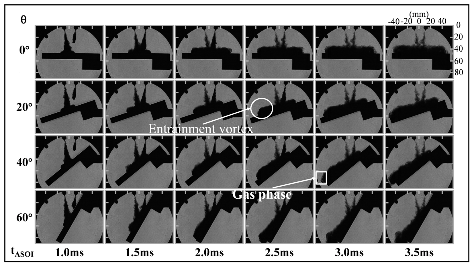 Diesel/methanol dual-fuel spray development at different wall-impingement angles.