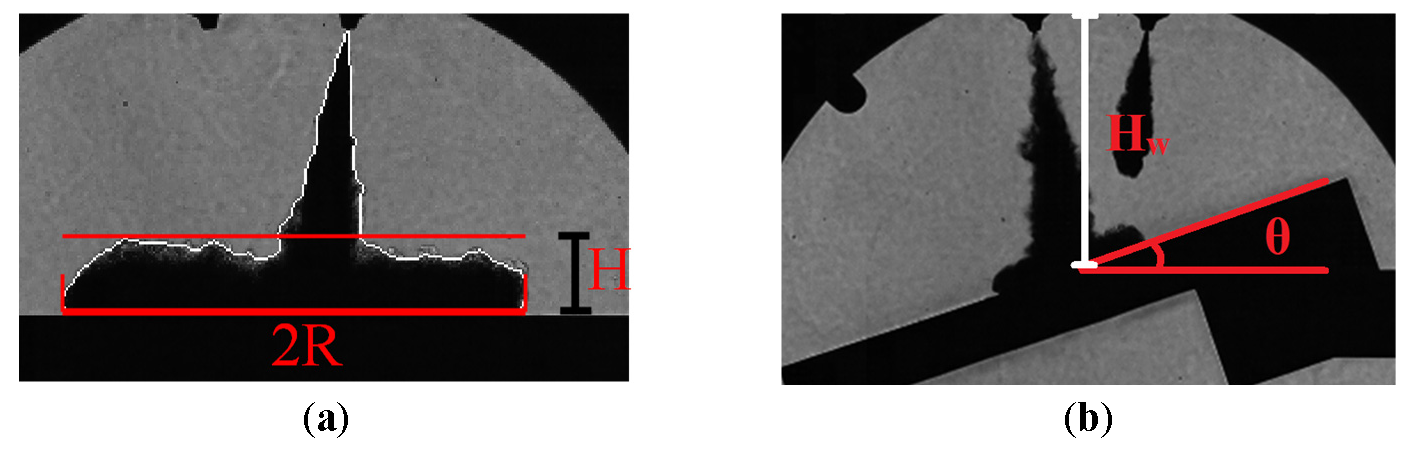 Figure 10 shows the evolution of the spreading radius of diesel/methanol dual-fuel sprays at different impingement angles. Before tASOI = 2.0 ms, the spreading radius increases with the impingement angle. This is because a larger angle reduces the momentum loss of impact, allowing the spray to spread farther along the inclined wall. After the end of the injection, the spreading evolution exhibits a different dependence on the impingement angle. At an impingement angle of 0°, the spray spreads symmetrically to both sides. Although the momentum loss upon impact is larger for this case, the symmetric two-sided spreading accelerates the late-stage growth of the spreading radius, eventually surpassing that at 20°.