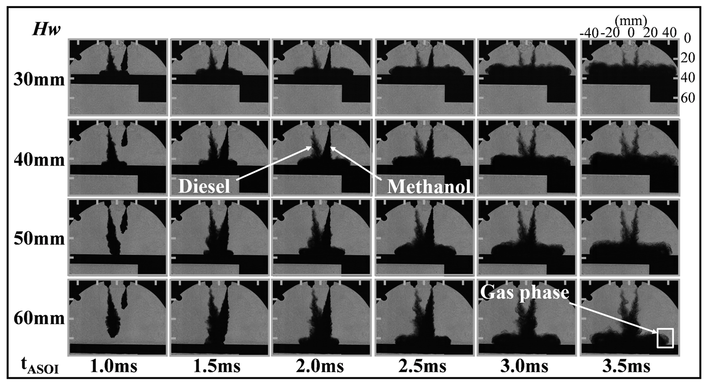 The wall-impingement distance (Hw) governs the droplet impact momentum and the ensuing near-wall dispersion dynamics, thereby shaping the extent of fuel adhesion and its spatial distribution on the surface. Accordingly, diesel/methanol dual-fuel spray impingement experiments were conducted at four selected distances (30, 40, 50, and 60 mm) at θ = 0°. As illustrated in Figure 6, the left nozzle is used for diesel injection, while the right nozzle is used for methanol injection. tASOI denotes the time after start of injection (ASOI), where tASOI = 0 is defined as the first observable spray appearance in the shadowgraph images. For reference and to isolate the contribution of dual-fuel interactions, single-fuel methanol impingement tests were additionally performed under identical operating conditions.