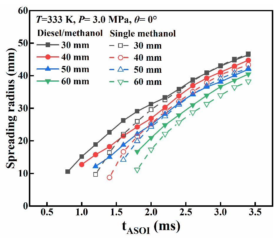 Compared with the diesel/methanol dual-fuel cases, the methanol single spray exhibits a smaller spreading radius before tASOI = 2.0 ms at all impingement distances, indicating weaker early-stage wall-parallel spreading. After tASOI = 2.0 ms, the spreading radii of the single- and dual-fuel sprays converge; however, their relative magnitude still depends strongly on the impingement distance, reflecting distinct spray-pray and spray-wall interaction pathways. For impingement distances of 30 mm, 40 mm, and 60 mm, the spreading radius of the methanol single spray remains smaller than that of the dual-fuel spray during the later stage. In the first two cases, the diesel spray reaches the wall first and spreads over the plate surface. The subsequently injected methanol spray contributes additional momentum during the later spreading process on the wall, resulting in a larger spreading radius for the dual-fuel spray. At 60 mm, substantial inter-spray collision and mixing occur before the sprays reach the wall, which elevates the overall momentum level of the dual-fuel jet. As a result, its spreading radius becomes larger than that of the methanol single-fuel spray. In contrast, at 50 mm, the methanol single spray exhibits a larger spreading radius than the dual-fuel spray in the later stage. This is because the methanol jet collides with the diesel jet immediately after the diesel spray contacts the wall, partially canceling the momentum and thereby weakening the spreading development of the dual-fuel spray.