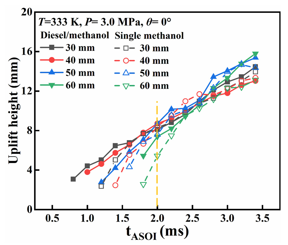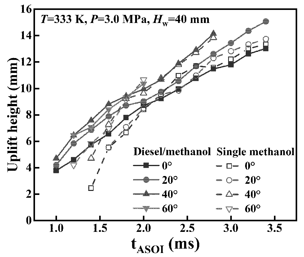 Compared with dual-fuel sprays, methanol single-fuel sprays exhibit lower uplift heights during the injection period and display limited sensitivity to small variations in impingement angle; a marked increase is observed only when the angle rises from 20° to 40°. This difference is attributed to the stronger inter-spray interactions in the dual-fuel case, both before and after wall impact, which enhance droplet breakup and rebound, thereby amplifying the dependence of uplift height on impingement angle. Overall, the impingement angle exerts a stronger influence on the dual-fuel sprays, showing an increase-decrease trend during injection and a clear angle dependence afterward. In contrast, the methanol single-fuel sprays exhibit only weak sensitivity to angle variation within the small-angle range.
