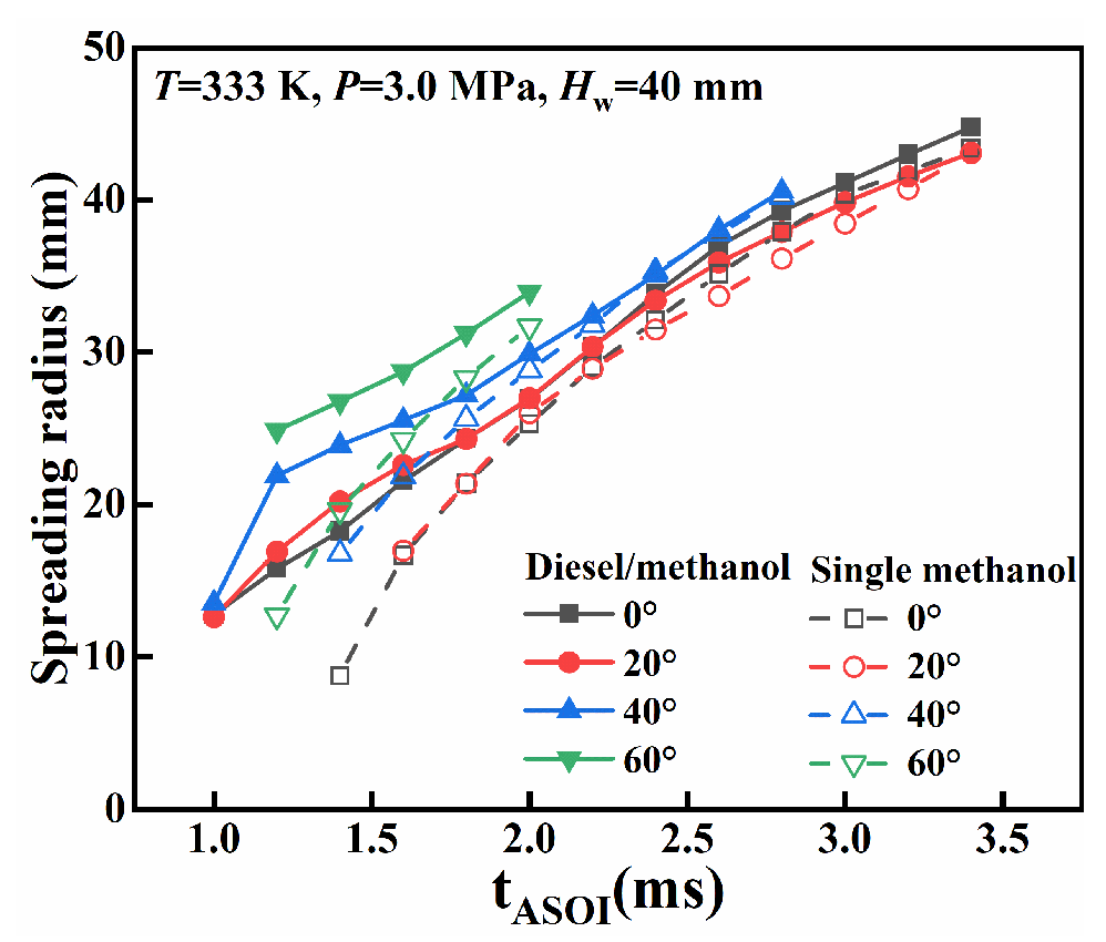 Compared with methanol single-fuel impingement, the dual-fuel sprays exhibit a larger spreading radius during the initial 2.0 ms, and the differences among angles are more pronounced. In the later stage, however, the spreading radius of the dual-fuel and single-fuel sprays gradually converges. It indicates that the addition of diesel enhances the wall-directed spreading momentum in dual-fuel impingement, thereby increasing the sensitivity of the spreading radius to the impingement angle.