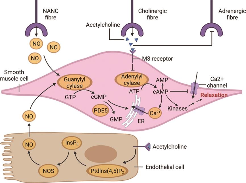 Figure 1.After sexual stimulation, non-adrenergic non-cholinergic (NANC) nerve fibers release nitric oxide (NO), initiating the activation of guanylyl cyclase that elevates cyclic GMP concentrations. Simultaneously, parasympathetic cholinergic nerve fibers release acetylcholine, which stimulates adenylyl cyclase to raise the cyclic AMP levels. These cascading processes initiate signaling pathways that reduce intracellular Ca2+ levels, resulting in the relaxation of smooth muscle cells.