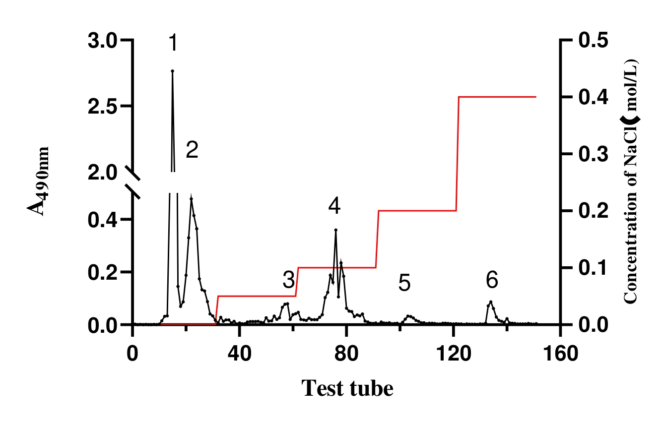 The deproteinized polysaccharide sample was dissolved in water (25 mg/mL), and heated (70 °C) to complete dissolution. Through the separation by DEAE Cellouse-52 column (Φ25 mm × 200 mm), the polysaccharide solution was eluted with distilled water and 0.05, 0.1, 0.2, 0.4 mol/L NaCl solution at a flow rate of 5.0 mL/min. A tube of isovolumetric elution solution was collected every 3 min and the polysaccharide content was determined using phenol-sulfuric acid assay. The elution curve was plotted with the number of tubes of eluent as abscissa and the absorbance at 490 nm as ordinate. The only eluting peak was collected and lyophilized.