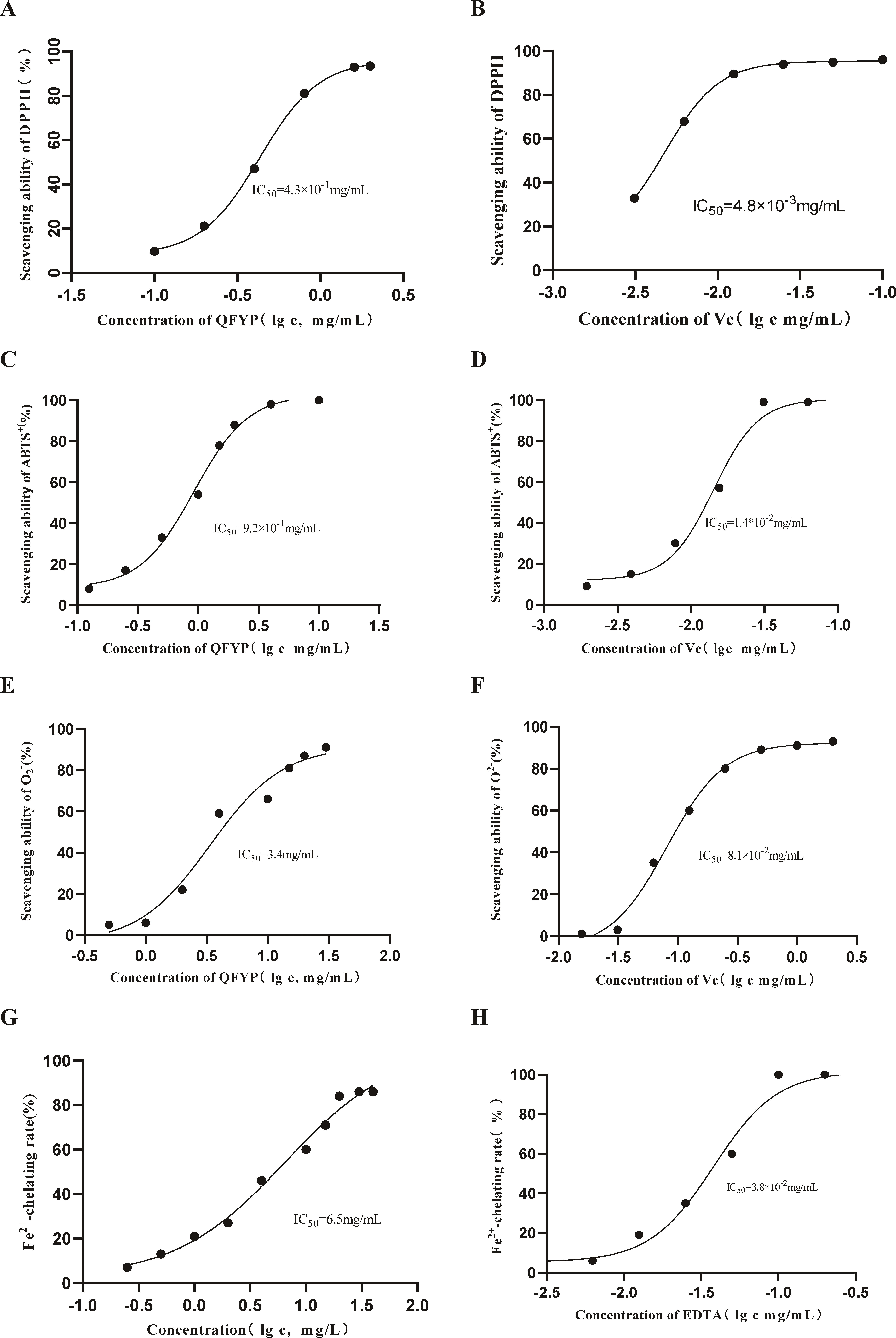 The DPPH radical, ABTS+ radical and O2- radical scavenging activities of QFY polysaccharides were increased with the increasing concentrations (Figure 2A,C,E). The IC50 of polysaccharides were 0.43 mg/mL, 0.92 mg/mL and 3.4 mg/mL for DPPH radical, ABTS+ radical and O2- radical, respectively. The IC50 of positive control vitamin C was 4.8 × 10-3 mg/mL, 1.4 × 10-2 mg/mL and 8.1 × 10-2 mg/mL (Figure 2B,D,F). Similarly, the Fe2+-chelating rate increased with the increase in the concentrations of QFY polysaccharides (Figure 2G). The IC50 of polysaccharides was 6.5 mg/mL, while the IC50 of positive control EDTA was 3.8 × 10-2 mg/mL (Figure 2H).