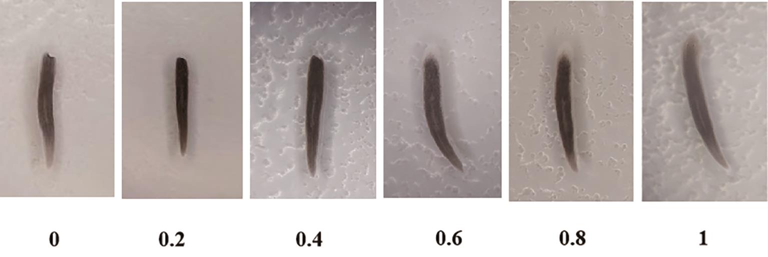 Figure 5.Regeneration scoring criteria for planaria. The score range of planaria regeneration was set at 0–1 modified from Henderson and Eakin 1959. 0: wound or lesion present; 0.2: wound closed but no blastema; 0.4: blastema formed; 0.6: eyespots begin to form; 0.8: auricles begin to form; 1: head completely formed.