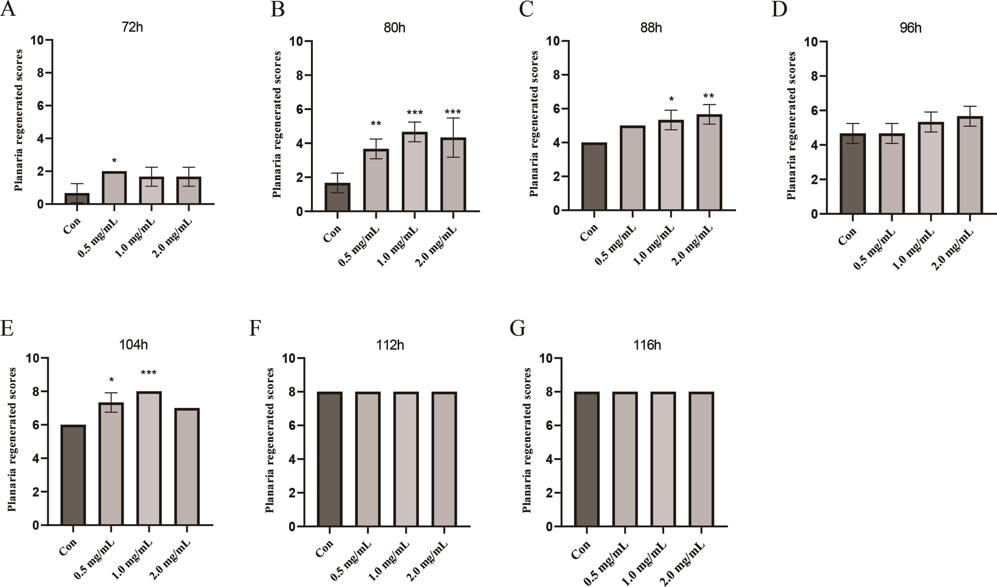 Figure 6.Effect of polysaccharide on planaria’ head regenerated scores at different time. (A–G) were 72 h, 80 h, 88 h, 96 h, 104 h, 112 h, 116 h. *** p <0.001, ** p <0.01, * p <0.05 vs. Con, mean ± S.D, n = 18. One-way ANOVA followed by Dunnett’s multiple comparisons test, GraphPad 8.0.