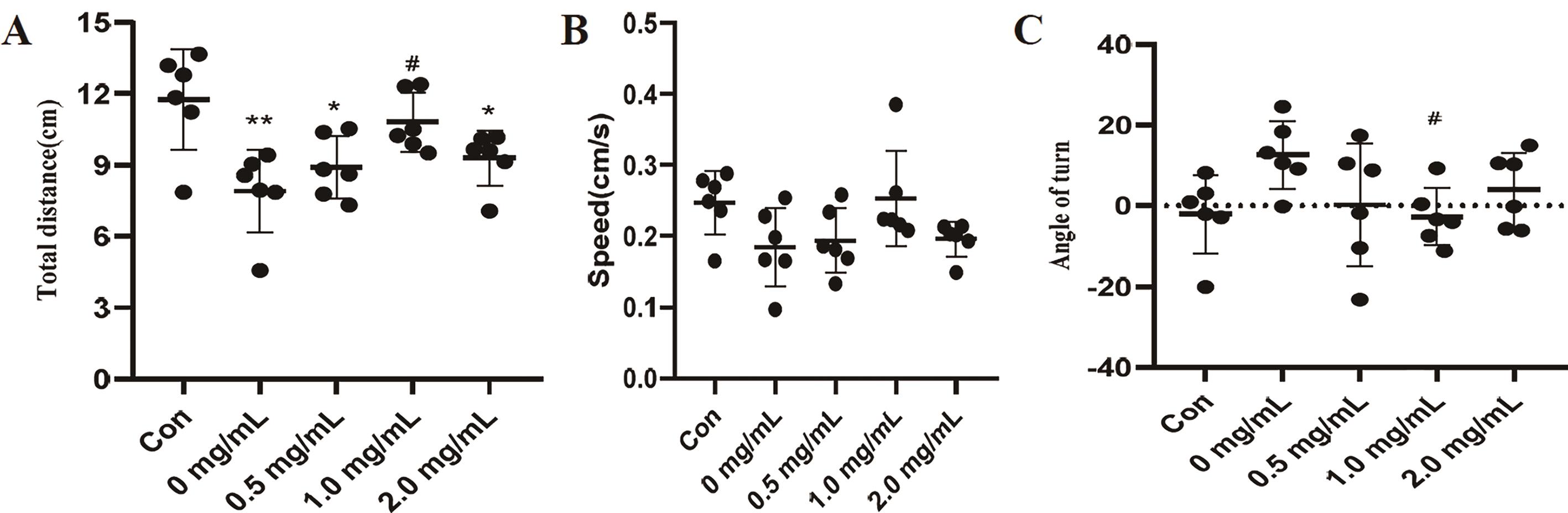 Figure 7.Effect of polysaccharides on total distance (A), speed (B), and angle change (C). Data are shown as the mean ± SEM. n = 6. * p < 0.05, ** p < 0.01 vs. Con group and #p < 0.05, vs. 0 mg/mL group by One-way ANOVA followed by Dunnett’s multiple.