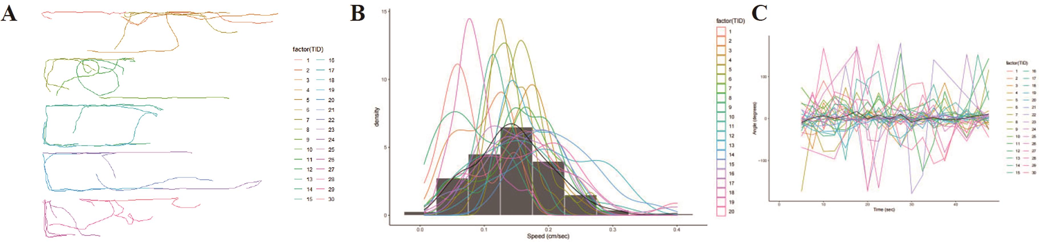 Figure 8.The motion trajectory diagram of planaria (A), speed of planaria (B) and motion angle of planaria (C). Con group: 1–6, 0 mg/mL group: 7–12, 0.5 mg/mL group: 13–18, 1.0 mg/mL group: 19–24, 2.0 mg/mL group: 25–30.