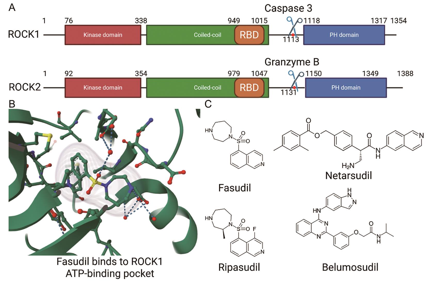 Figure 1.ROCK structure and drug targeting domain. (A) Structure of ROCK1 and ROCK2, Scissors located near the C-terminal inhibitory domain of ROCK1 and ROCK2 indicate the sites of proteolytic cleavage by Caspase-3 and Granzyme B, respectively. (B) The binding of fasudil to the ROCK1 ATP-binding pocket located in the groove formed by the N-terminal and C-terminal of the kinase domain. (C) Structural formulas of approved ROCK inhibitors. All currently available ROCK-targeting drugs act on the kinase domain as ATP-competitive inhibitors.