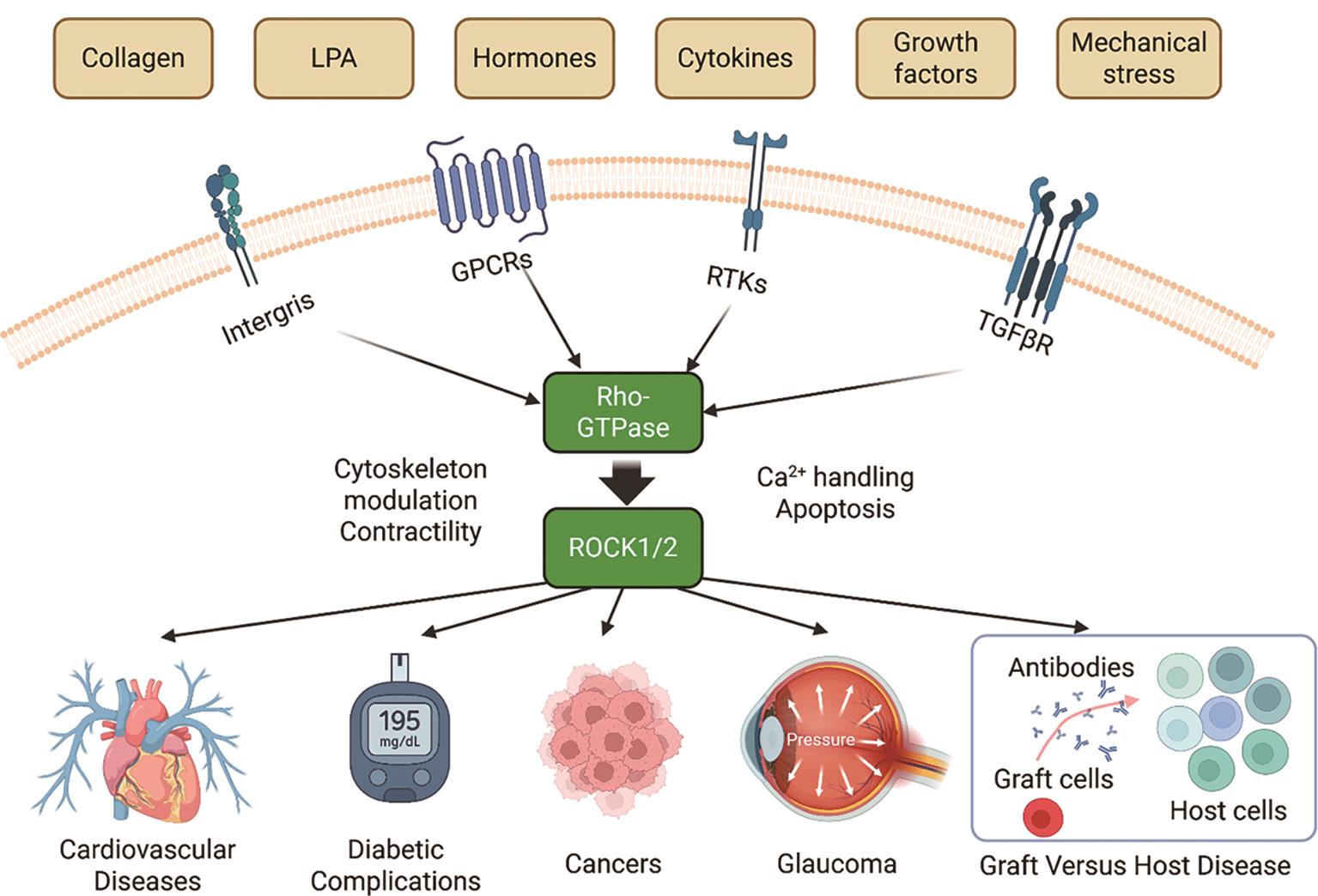 The therapeutic potential of Rho/ROCK signaling inhibition continues to expand across multiple disease domains, supported by a growing body of mechanistic and translational evidence. In ophthalmology, topical ROCK inhibitors have revolutionized the treatment paradigm for glaucoma and corneal endothelial diseases, with emerging evidence supporting their use in regenerative therapies and postoperative recovery. In cardiovascular and metabolic diseases, isoform-specific targeting of ROCK1 or ROCK2 holds promise for improving endothelial function, attenuating fibrosis, and protecting against diabetic complications such as cardiomyopathy and nephropathy. In the nervous system, ROCK inhibition offers a multipronged approach to modulate neuroinflammation, promote axonal regeneration, and potentially delay neurodegenerative processes. ROCK’s role in tumor invasion and the tumor microenvironment in oncology underscores its relevance as a co-target in metastatic disease. Moreover, the success of belumosudil in chronic graft-versus-host disease highlights the immunomodulatory potential of ROCK2-selective inhibition, paving the way for its application in other immune-mediated and fibrotic conditions. Despite these advances, challenges remain in achieving tissue-specific delivery, minimizing off-target effects, and elucidating the context-dependent roles of ROCK isoforms. Future directions will likely include the development of next-generation inhibitors with enhanced selectivity, optimized pharmacokinetics, formulation innovations, and deeper exploration of ROCK’s crosstalk with other signaling pathways in health and disease. Collectively, the Rho/ROCK pathway is a versatile and promising drug target with broad clinical relevance and substantial room for therapeutic innovation.
