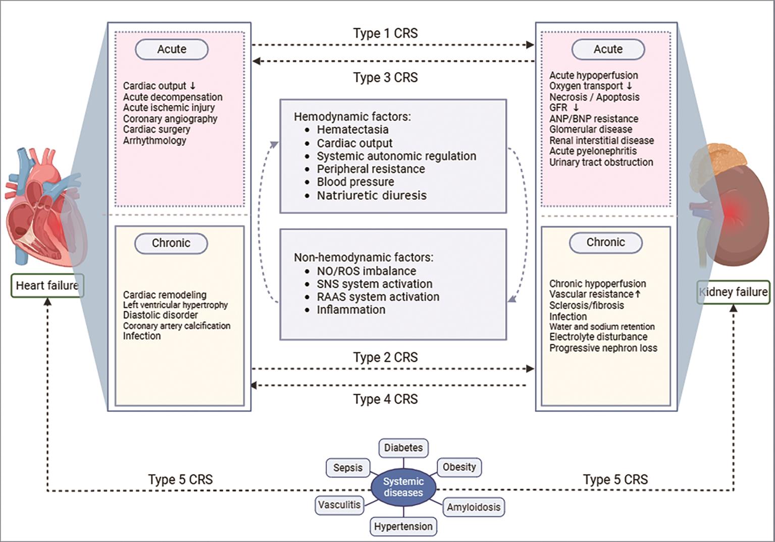 According to the CRS consensus document published by the Acute Dialysis Quality Initiative (ADQI) in 2008 [15]. CRS is systematically classified into five subtypes, characterized by the sequential involvement of organs and the nature of disease progression [16]. Type 1 CRS encapsulates a significant decline in cardiac function, such as acute cardiogenic shock or decompensated congestive heart failure, which subsequently induces acute kidney injury (AKI) [17]. Type 2 CRS is marked by chronic abnormalities in cardiac function, exemplified by chronic congestive heart failure, leading to the progressive exacerbation of CKD [18]. Type 3 CRS refers to the sudden deterioration of renal function, such as acute renal ischemia or glomerulonephritis, which triggers acute cardiac dysfunction encompassing heart failure, arrhythmias, and ischemia [19,20]. Type 4 CRS describes a scenario in which CKD, such as chronic glomerular disease, results in diminished cardiac function, cardiac hypertrophy, and elevated risk of adverse cardiovascular events [21]. Type 5 CRS encompasses systemic diseases, including diabetes, hypertension, sepsis, that result in concurrent cardiac and renal dysfunction [22].