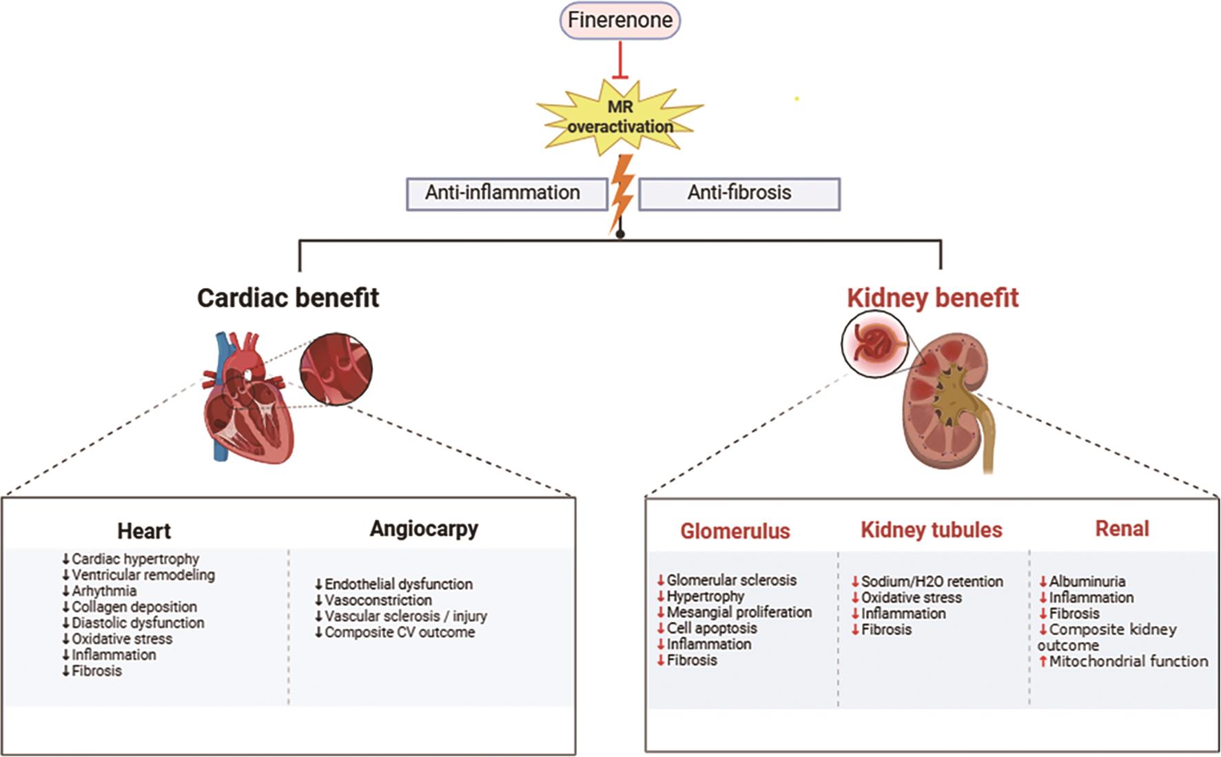 Finerenone targets mineralocorticoid receptor: Dual cardiac and renal benefits. Finerenone blocks the excessive activation of MR, exerting significant anti-inflammatory and anti-fibrotic effects, thereby achieving dual benefits for the heart and kidney.