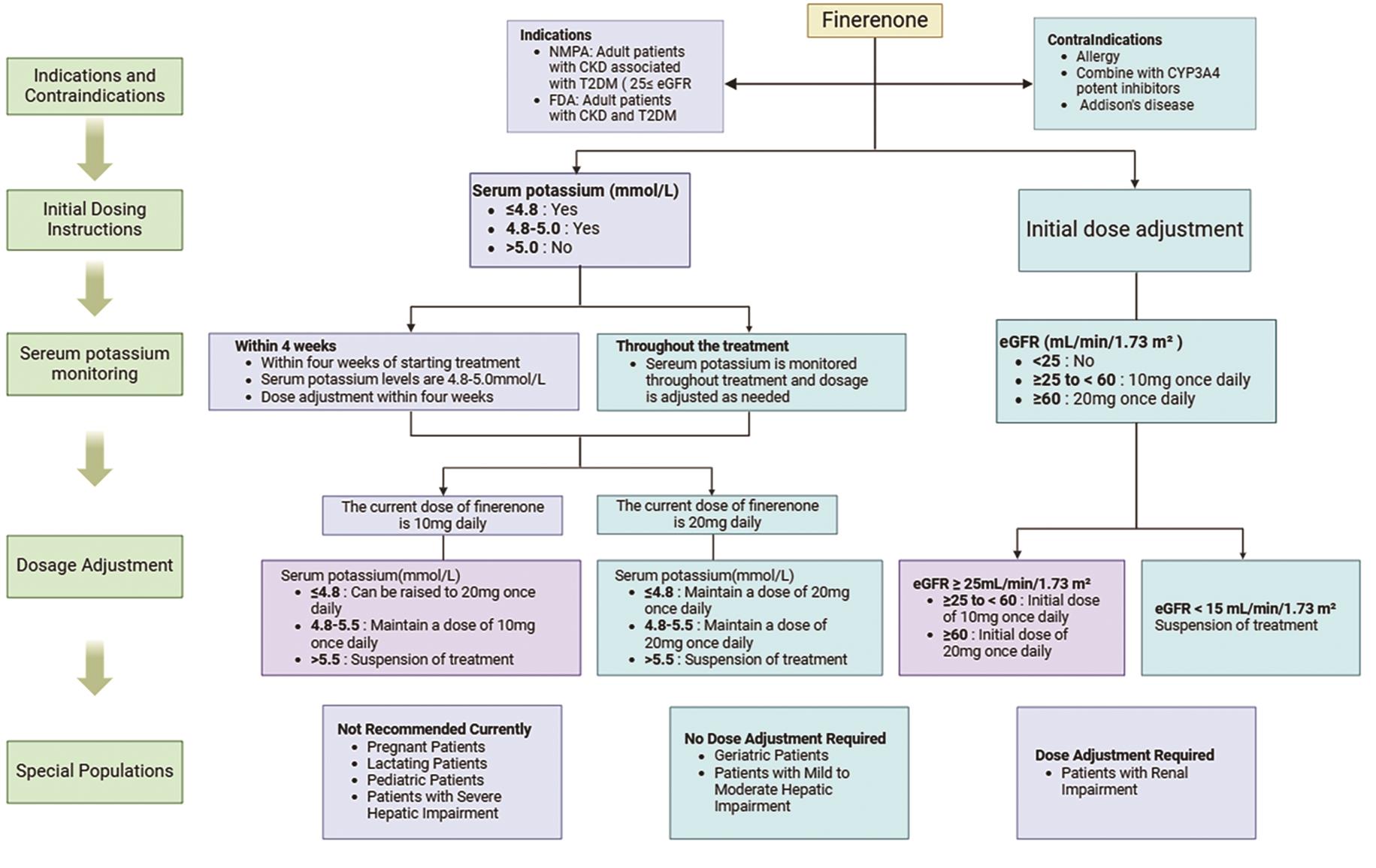 In conclusion, finerenone exhibits comprehensive benefits in the treatment of CRS. It significantly improves renal and cardiac functions while protecting multiple body systems through modulating inflammatory and fibrotic processes [112,132]. However, it is noteworthy that the specific effects of finerenone may vary among patients due to individual differences [133]. Therefore, when administering finerenone, it is imperative to tailor treatment plans based on the specific conditions and physiological characteristics of patients. Regularly monitoring relevant indicators to assess treatment efficacy and safety is also crucial [134]. By fully harnessing the multifaceted mechanisms of action of finerenone and adopting tailored treatment approaches, we can offer more precise and effective treatment options for patients with CRS, thereby improving their clinical outcomes and quality of life [13,134]. However, there remains insufficient research on its long-term effects and safety. Therefore, clinical medication should strictly comply with the principles of rational drug use and dose adjustment (Figure 4). Further studies are required to confirm its efficacy and safety across various patient populations.