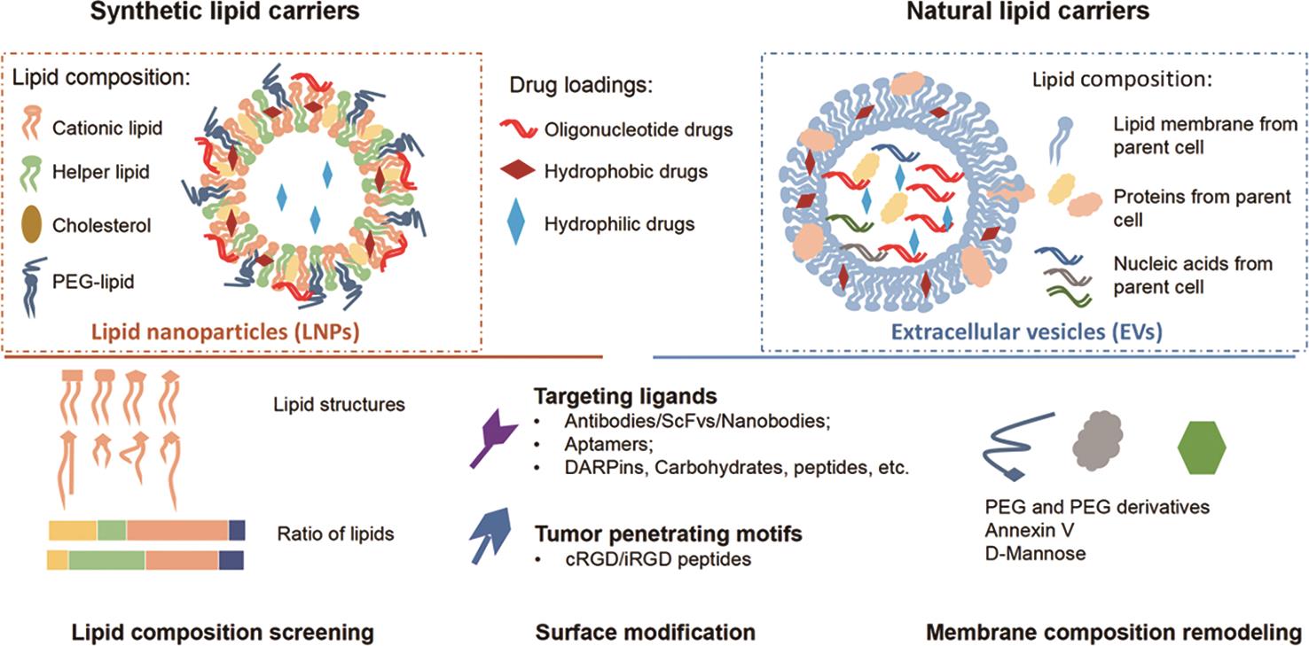 With new advances in drug formulation and delivery technologies, nanomedicine has been advancing at a rapid pace and offering more effective therapeutic solutions to drug development [1–3]. Among diverse categories of nanomedicine, oligonucleotide-based medicine is small in size but significant for modulating biological functions, attracting interests from academia and industries for the treatment of various diseases [4,5] as highlighted by the 2024 Nobel-prized revelation of physiological functions of microRNAs. Oligonucleotides require protective carriers against enzymatic degradation, and clearance from circulation [1], underscoring the necessity for stable transportation by carriers in vivo. Lipid carriers, including lipid nanoparticles (LNPs) and extracellular vesicles (EVs) such as exosomes, have emerged as promising platforms for delivering therapeutic agents [1,6,