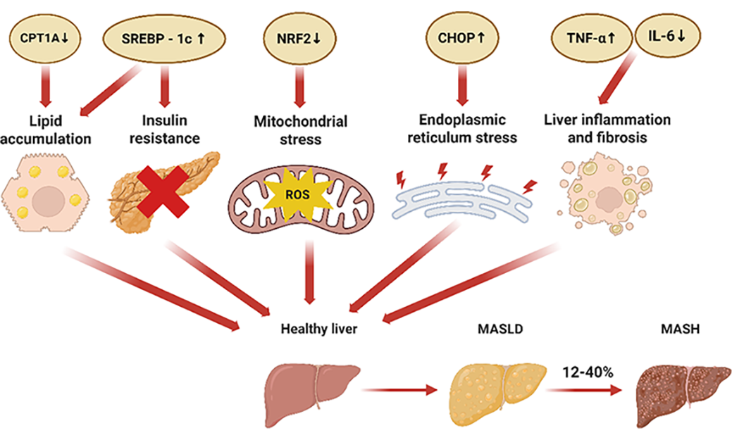 One of the key hallmarks of MASLD is the accumulation of intrahepatic triglycerides (TGs) [51]. Although the liver is not a primary site for lipid storage, ectopic fat deposition can occur under pathological conditions. Factors such as obesity, insulin resistance, and metabolic syndrome result in an excess of fatty acids in the liver. This lipid overload disrupts normal hepatic metabolic processes, impairs hepatocellular function, and promotes the development of MASLD [52].