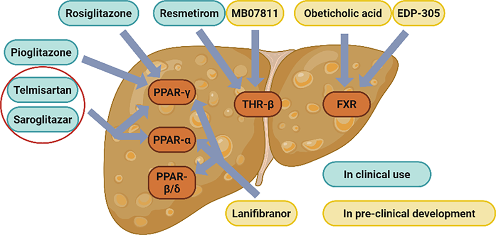 Dual and pan PPAR agonists have shown greater promise than subtype-selective PPAR agonists in the treatment of MASLD/MASH [92]. Telmisartan, a dual PPAR-α/γ agonist, not only enhances insulin sensitivity and controls hypertension, but also promotes the expression of genes involved in β-oxidation and fat deposition in adipocytes [22]. Furthermore, telmisartan downregulates genes associated with pro-inflammation and oxidative stress, contributing to its prevention and treatment of MASLD [22].