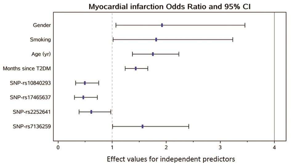 The stepwise regression analysis followed by multivariate logistic analysis regarding diabetic MI and the patient’s lab results is shown in Table 3. After adjustment for other risk factors, stepwise regression assay indicated that four SNPs (SNP-rs10840293; SNP-rs17465637; SNP-rs2252641; SNP-rs7136259) were correlated with diabetic MI and was an independent predictor for the disease (SNP-rs10840293, hazard ratio, 0.493, 95% CI, 0.323–0.752, p = 0.001; SNP-rs17465637, hazard ratio, 0.466, 95% CI, 0.300–0.724, p = 0.0007; SNP-rs2252641, hazard ratio, 0.613, 95% CI, 0.386–0.973, p = 0.0377; SNP-rs7136259, hazard ratio, 0.561, 95% CI, 1.007–2.418, p = 0.0464). The effect of independent factors on the risk of MI is presented in Figure 1.