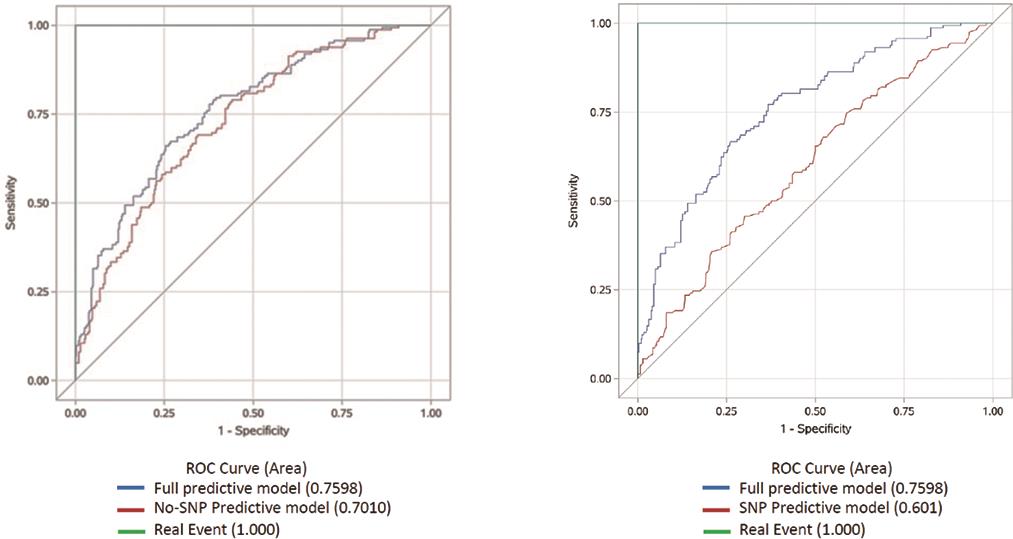 To evaluate the potential gain of statistical power by integrating SNPs in the prediction model, we statistically tested the difference in AUC between the full model and the No/Only SNPs models. As shown in Table 4, the difference of AUC between the full model (AUC = 0.76) and No-SNP model (AUC = 0.73) did not reach significance (p = 0.09), while the full model presented significantly higher AUC than the Only-SNP model (p < 0.001). In consistence with the results shown in Table 4, Table 5 shows in terms of net reclassification improvement that the full model has better performance than Only-SNP model, while not the case for the No-SNP model.
