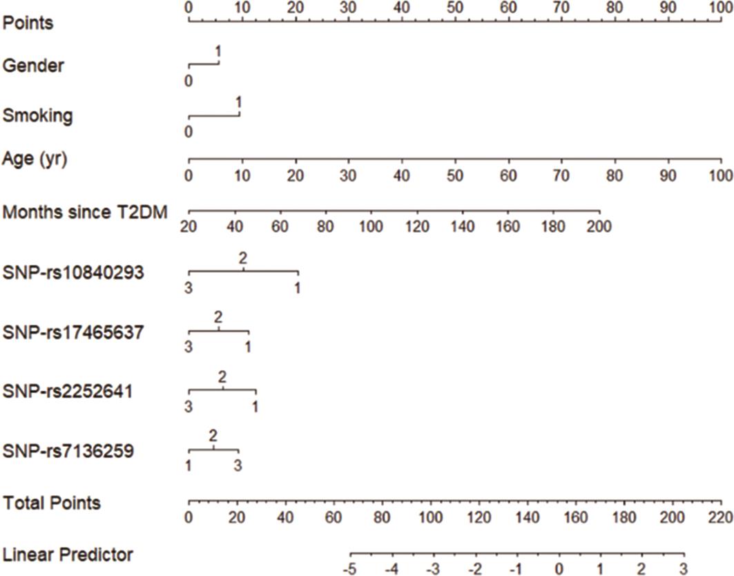 To facilitate the clinical application of our full prediction model, a forecast model diagram was developed (Figure 3). When a patient is associated with the risk factors (gender, smoking, age, T2DM history, the number of four SNPs identified), the diagram can be used to calculate the total points and evaluate their risk for MI.