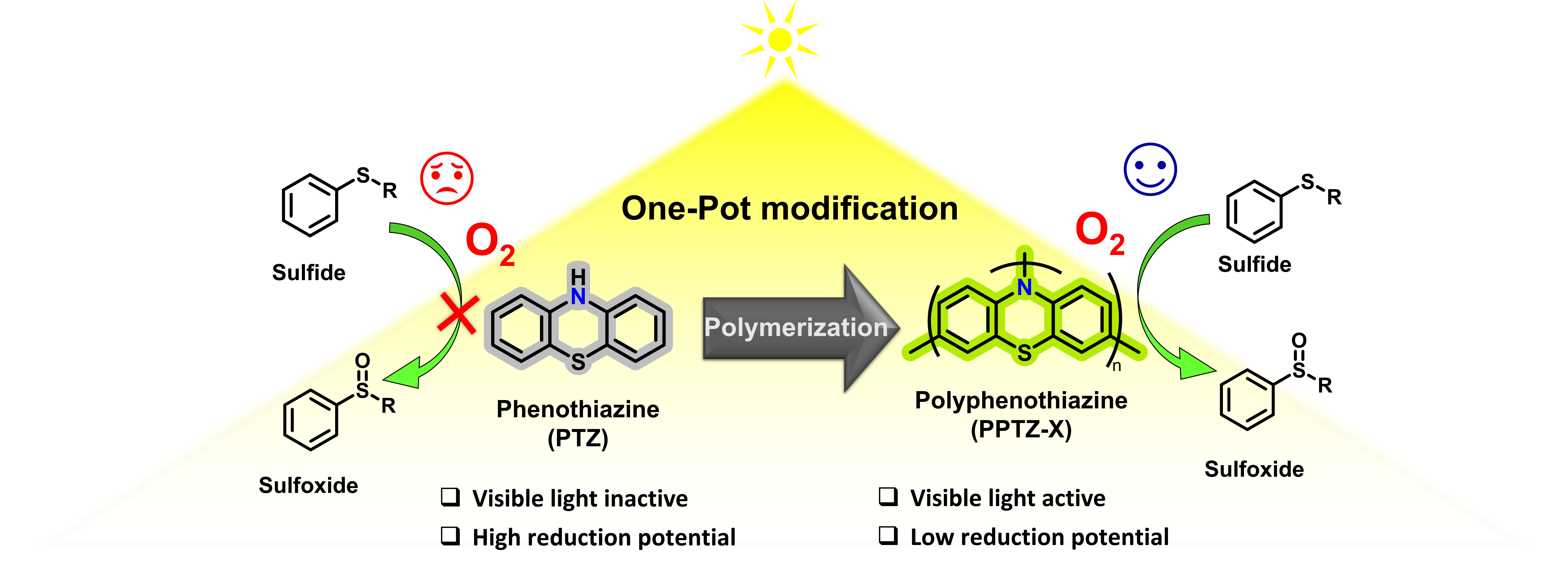 Phenothiazine (PTZ) and its derivatives have been widely explored for photocatalytic molecular oxygen activation in various chemical transformations due to their high reduction potential. However, their photocatalytic activity is restricted to UV light irradiation because of a wide band gap (~3.56 eV). In this work, we report a single-step polymerization of PTZ to synthesize nanostructured polyphenothiazene (PPTZ). The resulting PPTZ exhibits a significantly reduced band gap (~2 eV), enabling efficient visible-light absorption. Furthermore, polymerization using different oxidizing agents modulates the morphology of PPTZ nanoparticles, leading to distinct photocatalytic performances. As a metal-free photocatalyst, PPTZ nanoparticles demonstrate excellent activity toward the selective aerobic oxidation of sulfides (SAOS) under visible-light irradiation. High sulfide conversions of up to 99% with selectivity exceeding 99% were achieved. Moreover, the photocatalyst is recyclable for at least three consecutive cycles without any significant loss in performance, highlighting PPTZ-based nanomaterials as promising visible-light-active photocatalysts for SAOS reactions.