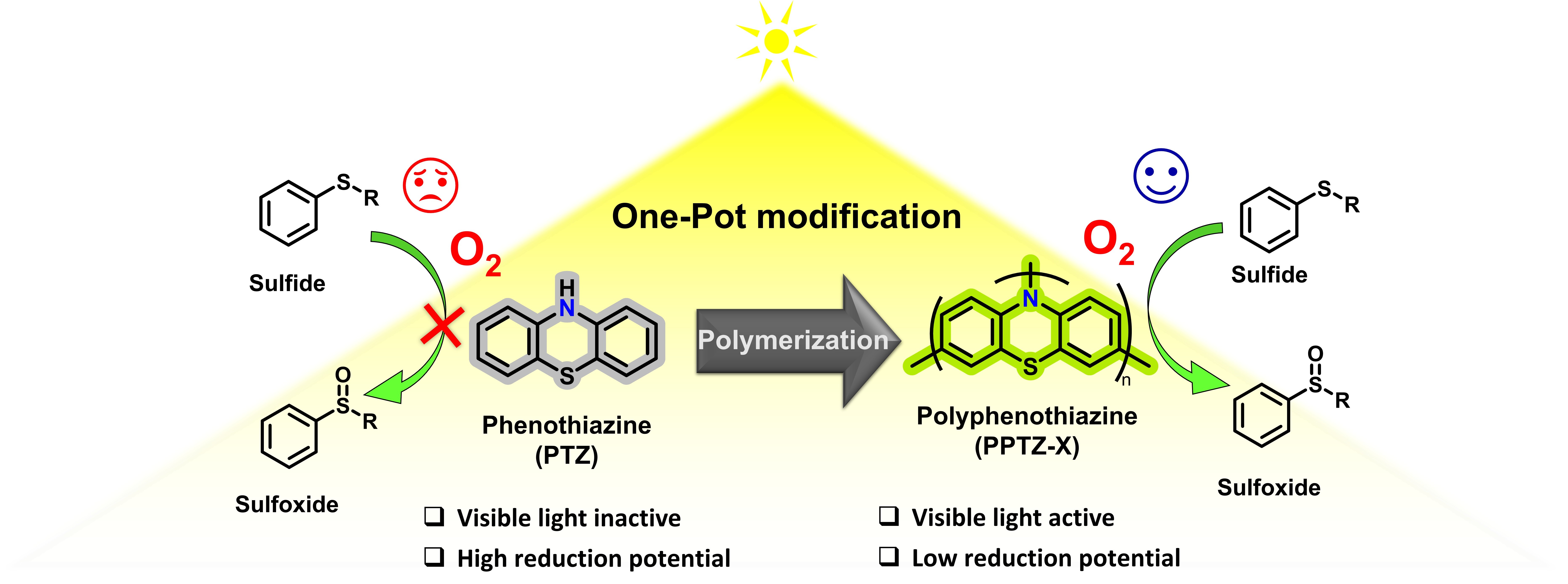 Cover story: Sulfoxides are essential structural motifs in pharmaceuticals and fine chemicals. Selective aerobic oxidation of sulfides (SAOS) is an important photochemical transformation for the synthesis of sulfoxides from sulfides. We developed nanostructured polyphenothiazene (PPTZ) through a single-step polymerization of phenothiazine (PTZ), which narrows the band gap from ~3.56 eV to ~2 eV for efficient visible-light absorption. Varying the oxidizing agent tunes PPTZ nanoparticle morphology and photocatalytic performance. As a metal-free photocatalyst, PPTZ drives SAOS under visible light, delivering up to 99% conversion and >99% selectivity. Thus, PPTZ nanomaterials emerge as promising visible-light catalysts for green pharmaceutical production.