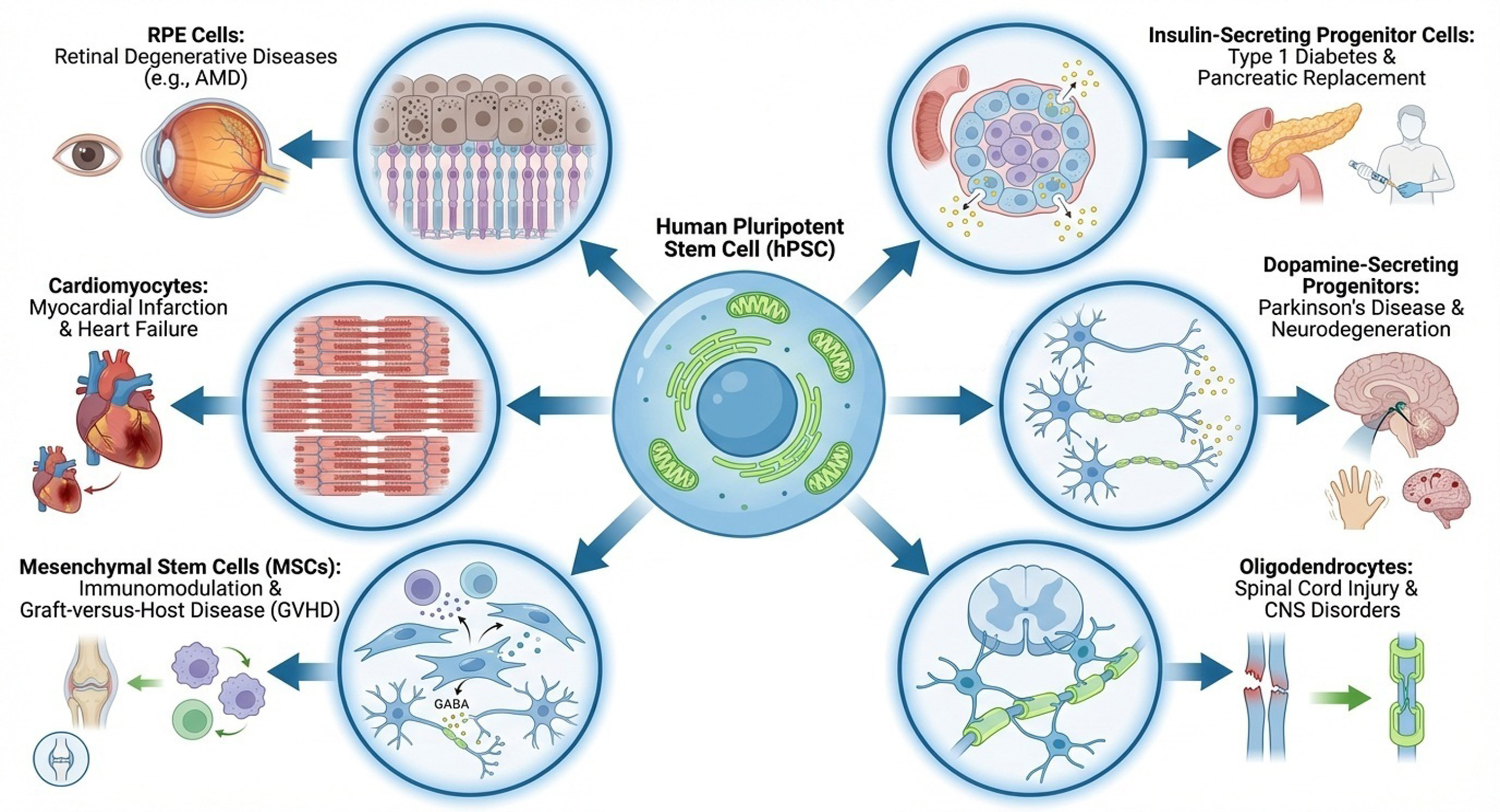 Human pluripotent stem cells (hPSCs) can be differentiated into any type of tissue cells in the human body. Several clinical trials have been started for the medical care of patients with organ failure, such as those with retinal degeneration diseases (including age-related macular degeneration), Parkinson’s disease, type 1 diabetes, spinal cord injury, epilepsy, myocardial infarction, graft-versus-host disease (GvHD), and cancer, using specific hPSC-derived tissue cells such as retinal pigment epithelium cells, insulin-secreting progenitor cells, dopamine-secreting progenitor cells, oligodendrocytes, GABAergic neurons, cardiomyocytes, mesenchymal stem cells, and engineered natural killer cells. We discuss which cell sources or cell types are promising for clinical applications, such as (i) universal hPSCs or conventional hPSCs and (ii) mature differentiated cells or progenitor cells. Especially, we discuss the progress of clinical trials using hPSC-differentiated cells in this review.