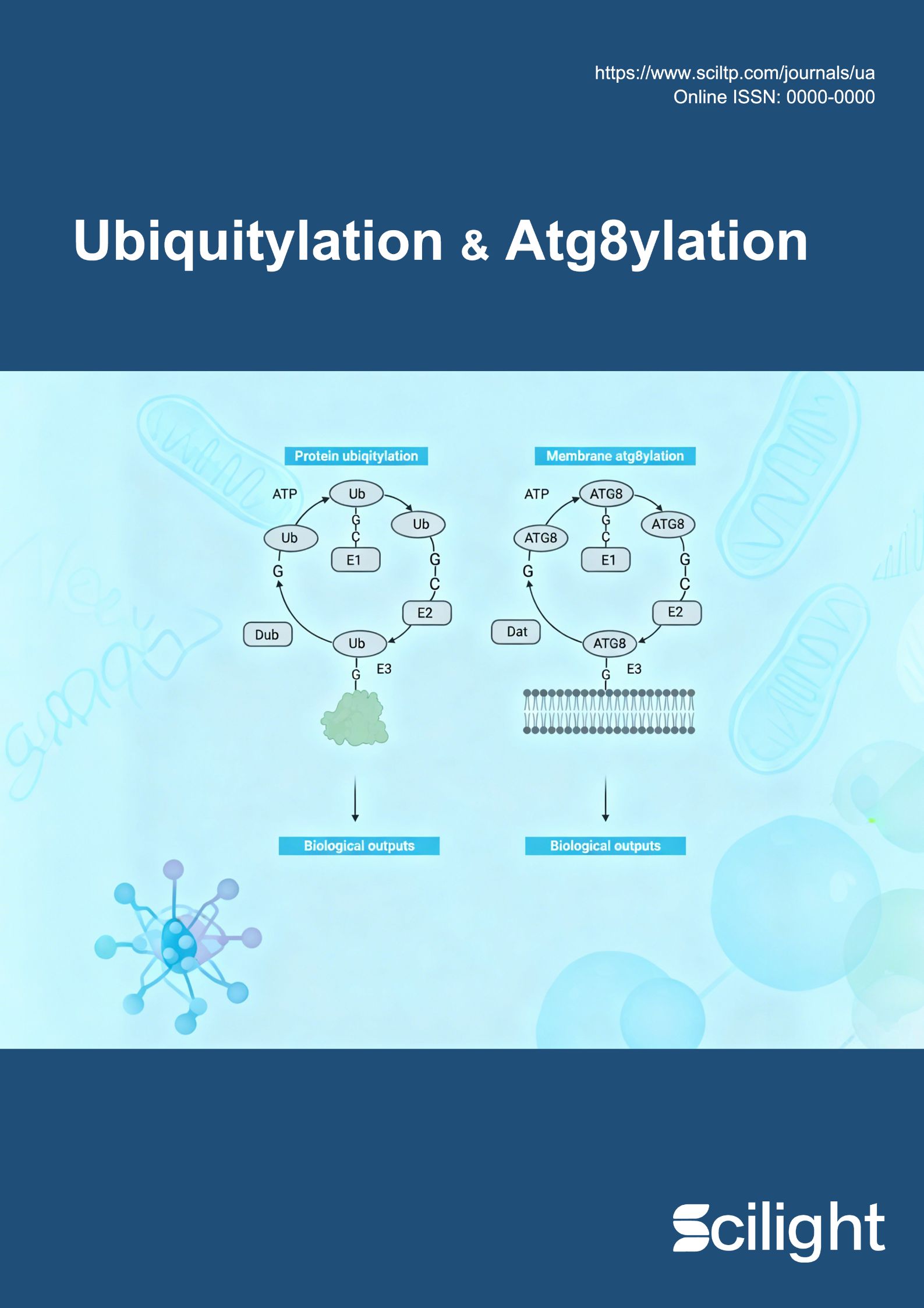 Ubiquitylation & Atg8ylation (U&A) is a gold open access, peer-reviewed journal that aims to provide a premier forum for a broad coverage of research in the field of modifications of proteins and membranes. The primary focus is on ubiquitin-like molecules (Ubiquitin, Atg8s, SUMO, NEDD8, ISG15, ATG12, UFM1, FAT10, and URM1) whereas other post-translational protein modifications and membrane modifications and remodeling are also of high interest to the journal. The impetus for the creation of U&A comes from the ongoing developments in biology showing that membranes, just like proteins, undergo covalent modifications with many biological outputs, opening a new and growing field of study. However, U&A aims to be a broad scientific home for the study of any type of biological system that utilizes ubiquitin, Atg8s, or other ubiquitin-like molecules. More